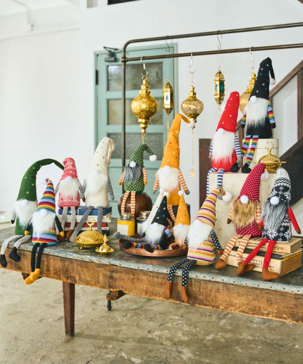 A doll of Tonttu, an old Finnish fairy. She sits at home or at a camp and wishes happiness to people. The hat has a wire at the end and can change its shape freely.