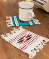 Cool coasters with an Ortega pattern that looks like a rug turned into a smaller rug. A fun way to enjoy a drink. It can be used to place accessories knick-knacks, vases, houseplants, or as an accent on a shelf or table.