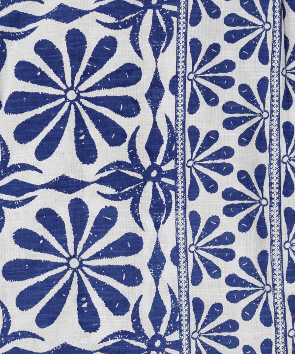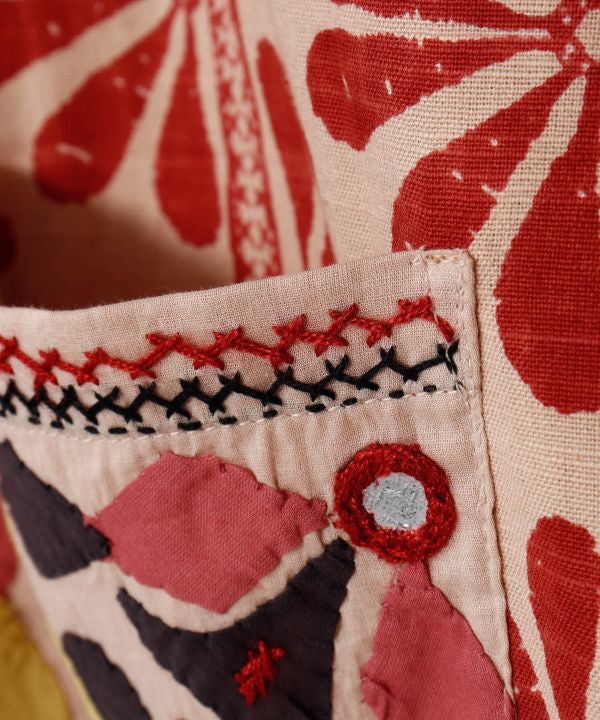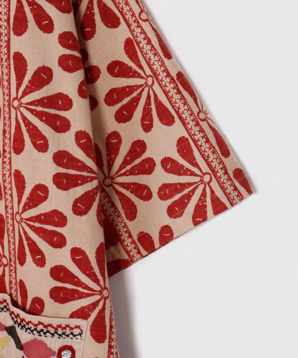 Open-collared shirt design for a loose fit and a liberating feel. The design is inspired by the Kutchi people who live in the state of Kujarat. Boldly expresses mirror work embroidery, a handwork unique to the Kutchi people. Cool Indian cotton slub material. This textile with a strong presence makes a special outfit that enriches and colors your everyday life.
