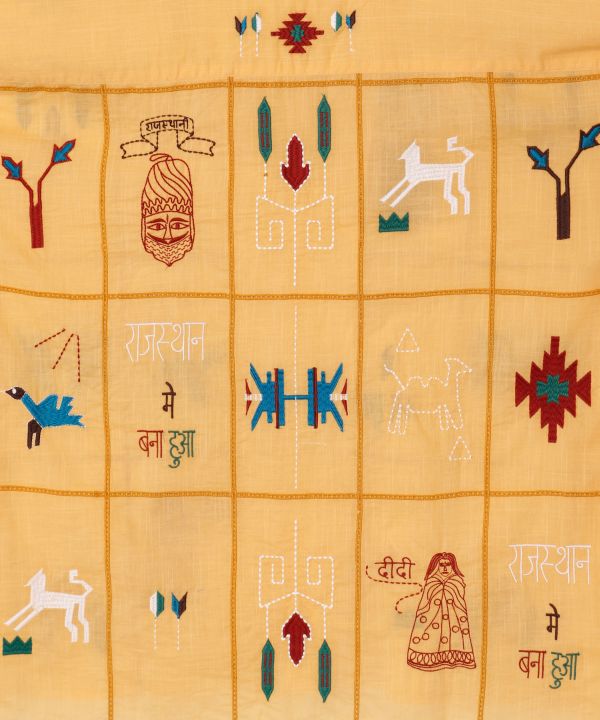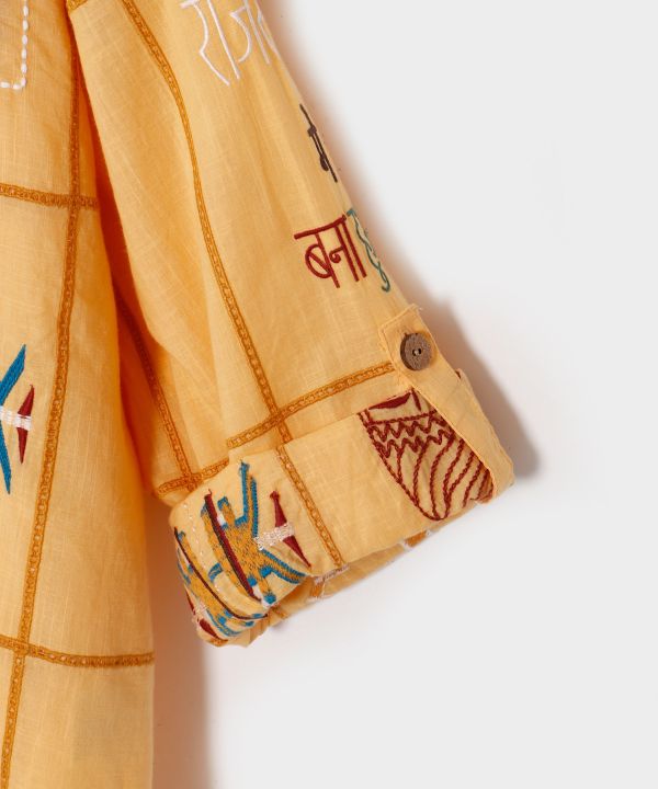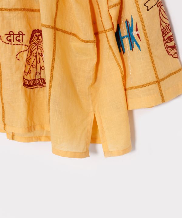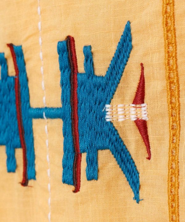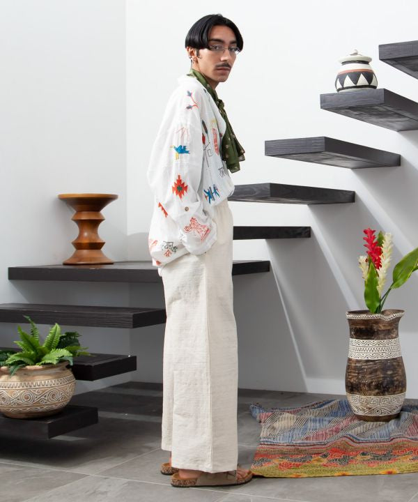 This men's shirt is made of soft and breathable cotton and can be worn in all seasons. Two types of embroidery depict the people of Rajasthan and the ancient history of Rajasthan rugs. By opening the buttons and matching an inner layer you can enjoy a variety of coordinates.