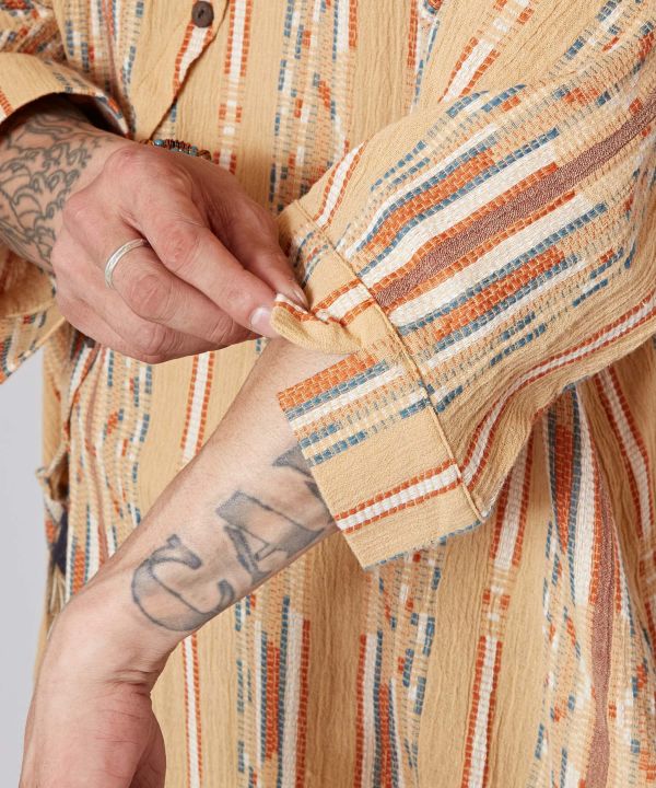 Men's top made of South Indian jacquard fabric. Asymmetrical shaped design. Oversized and loose-fitting. The soft to the touch texture and airy, rough weave fabric is a rustic and lovable piece.