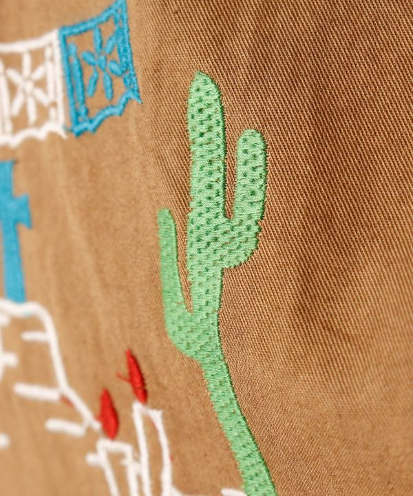 Men's shirt with hand-embroidered Mexican motifs that exude warmth. The one-of-a-kind silhouette is a cross between a Mexican jacket and elements of the guajabera, the formal Mexican dress. In addition, the bold, casual embroidery focuses on the use of gorgeous colors and storytelling placement. The detailed blanket stitching is eye-catching, and this is a piece that will make you the star of the show just by wearing it. The smooth feel allows it to be worn as a shirt outer. The motif of the embroidery is the "ofrenda," an altar decorated on the Mexican "Day of the Dead. Various favorite foods of the dead, marigolds, candles, papel picado, etc. are arranged.