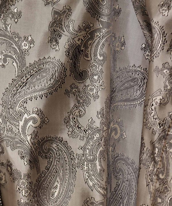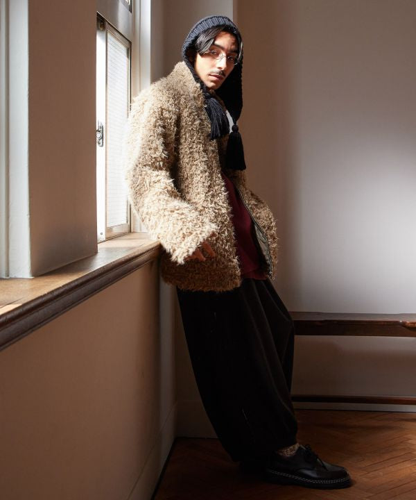 Men's jacket in comfortable poodle fur fabric. The glossy paisley pattern lining adds to the luxurious feel. The front closure has a metal hook and zipper. A coin charm on the tape section adds an accent. This item is inspired by the fur winter wear worn by Tibetan nomads.