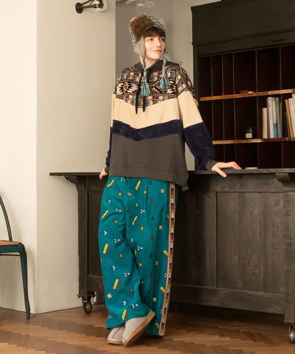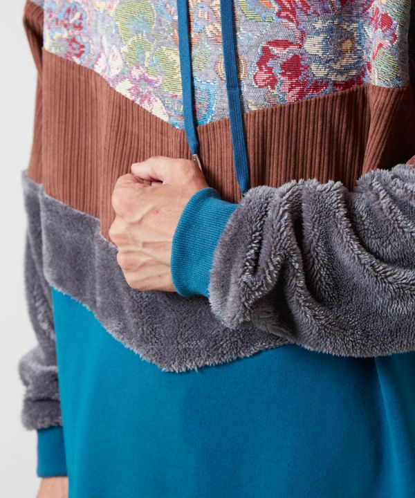 Luxurious patchwork of four different fabrics - gobelins, backed wool, fur, and corduroy - gives this men's top a presence that makes it the star of a single cord. Can be worn for a long time regardless of the season. The pattern development inspired by the Silk Road "carpet belt" and the Gobelins fabric, which has a different pattern appearance depending on the item, give it a unique character.