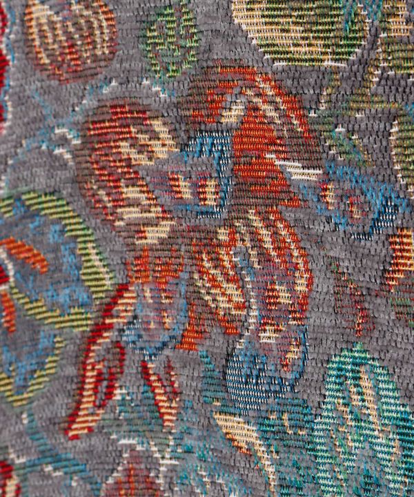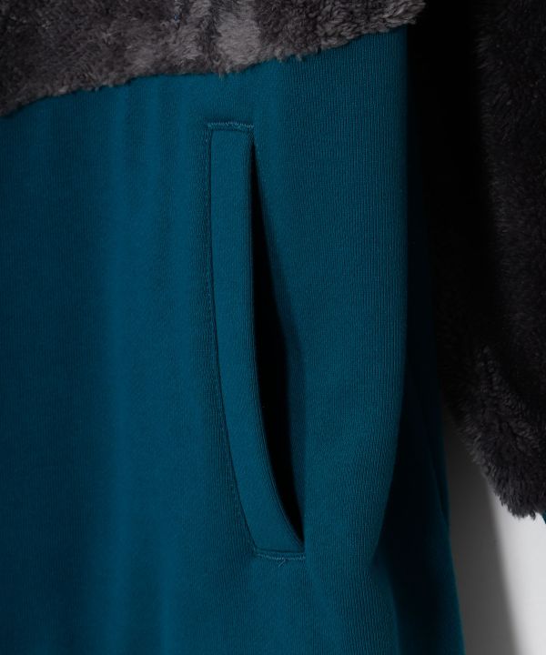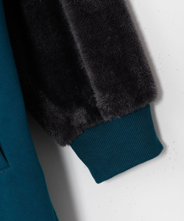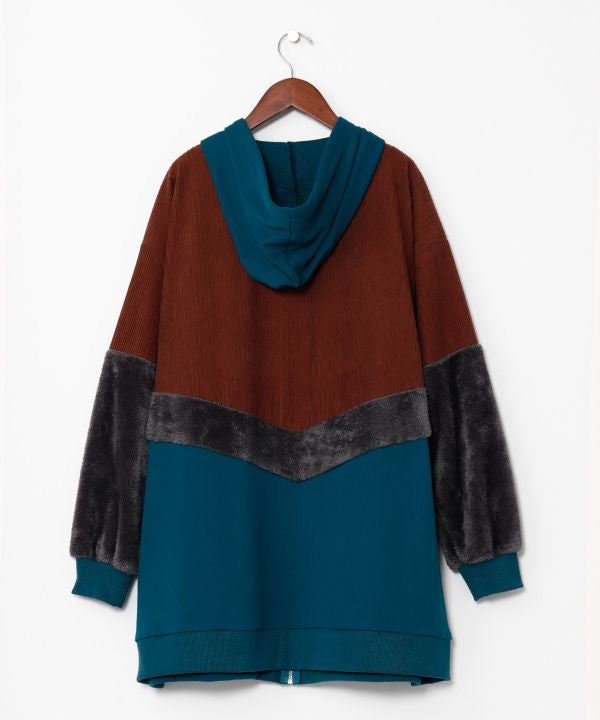 This men's zip hoodie has a presence that makes it the star of your coordinate with just one piece featuring a luxurious patchwork of four different fabrics: gobelins, backed wool, fur, and corduroy. The pattern development is inspired by the "carpet belt" of the Silk Road, and the Gobelins fabric, with its different patterns appearing in different ways, gives it a unique character. It can be worn for a long time as a cloak, even during periods when it is difficult to adjust the temperature.