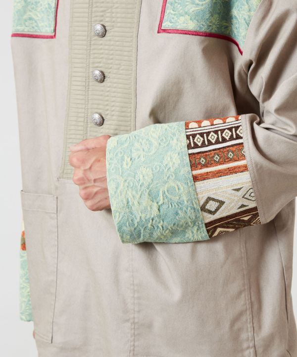 Men's top with an eye-catching combination of different materials: denim stretch twill, and jacquard. The design is inspired by the traditional costumes of the Yao people. The soft stretch fabric is lightweight and comfortable for unisex wear. This item will add a touch of individuality to your coordination.