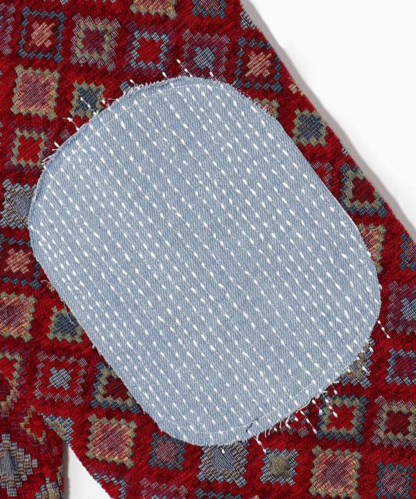 This men's cardigan features a combination of denim and jacquard fabrics and different materials. The relaxed body width and longer length make this piece easy to match with a variety of coordinates. The pattern motif is a Kilim pattern called "devil's eye" which means "repelling evil. The denim portion is washed and the edges are cut off to create a vintage look. It is an item that has its own individuality.