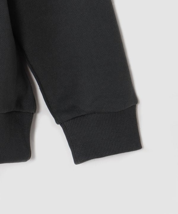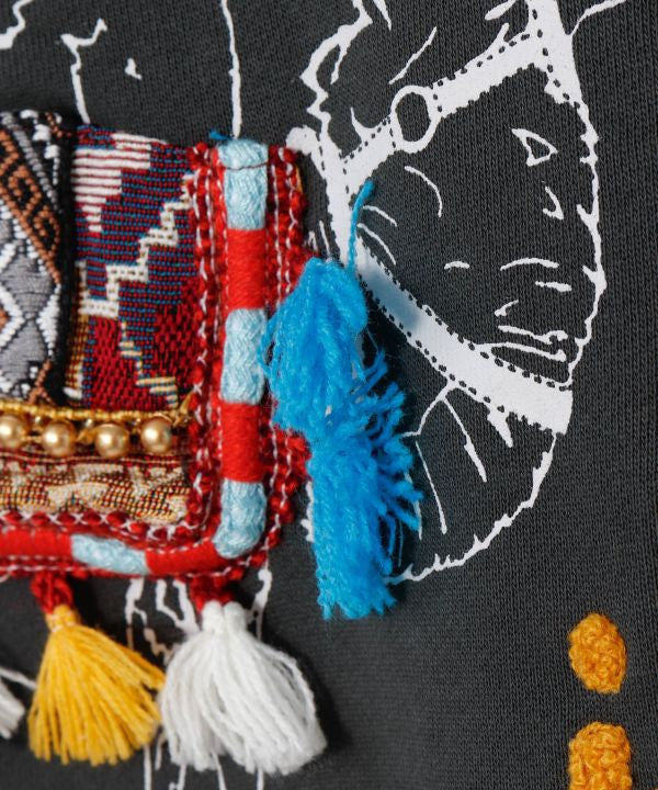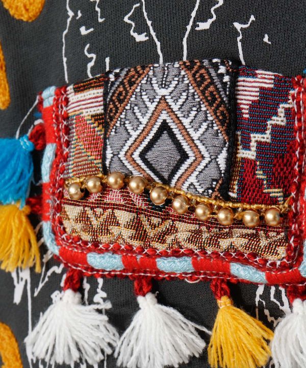 Men's sweatshirt in a basic shape with a casual folklore feel. The folkloric embroidery on the chest is based on the motif of camels in Uzbekistan, a crossroads of cultures, expressing the mixed atmosphere of various cultures and the carrying of rugs and carpets. The Sagara embroidery of "HOP ON THE DESIERT SHIP" is also a key point.