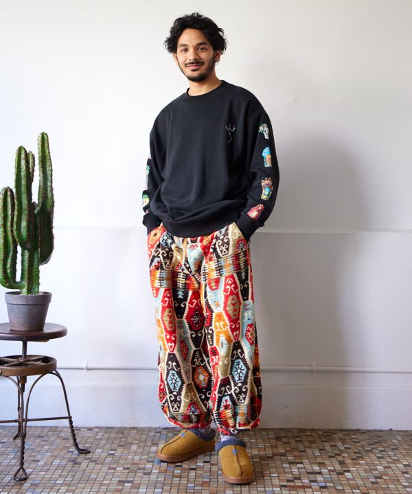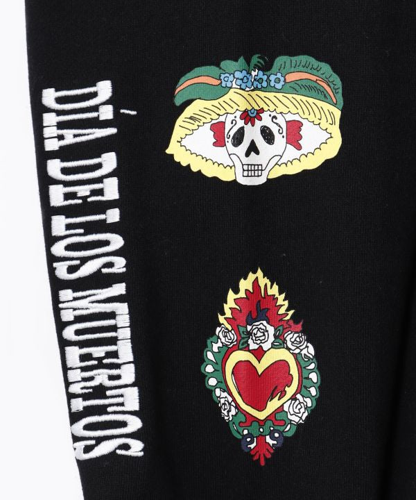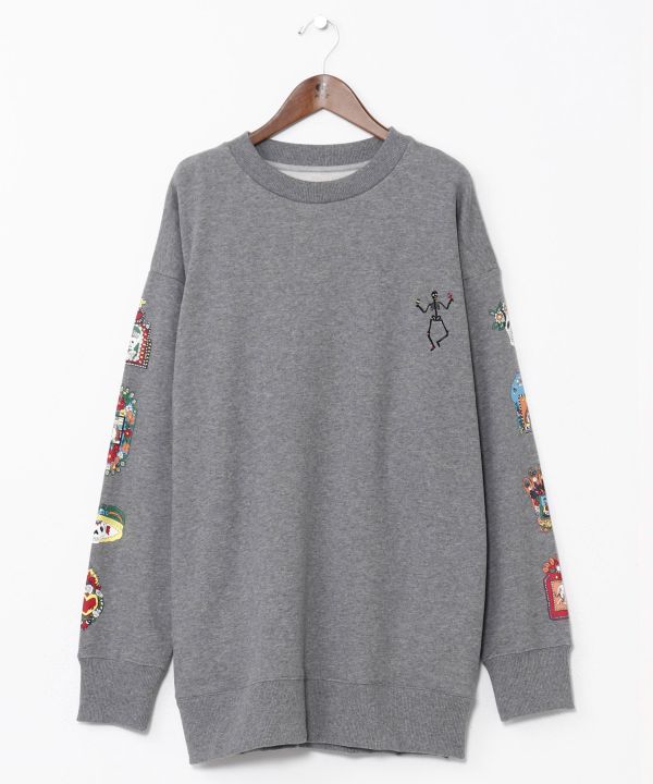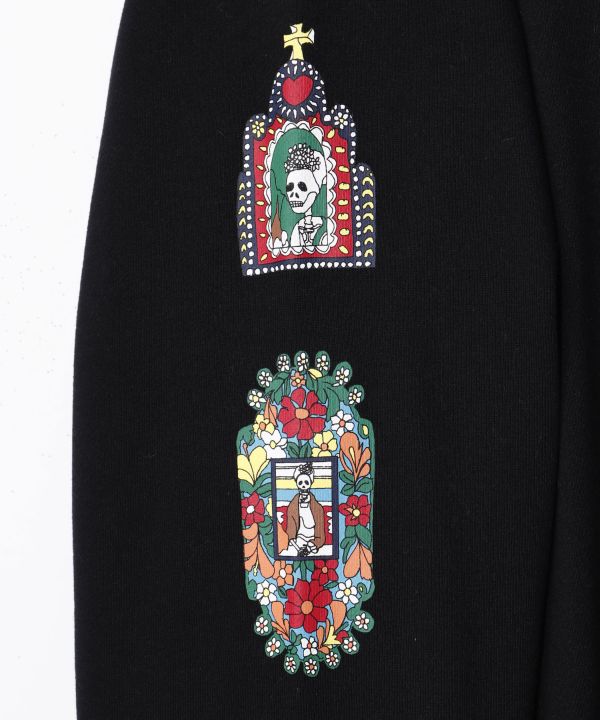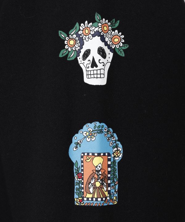Amina x grn collaboration project. Luxurious men's top with embroidery and prints, made of firm, lined fabric. With pockets on both sides. The stretchy material and loose-fitting size make it comfortable to wear. On the sleeves, embroidery of Dia de os muertos (Day of the Dead) in Spanish and a print of calaveras in the motif of a photograph displayed on an ofrenda (altar) are placed.