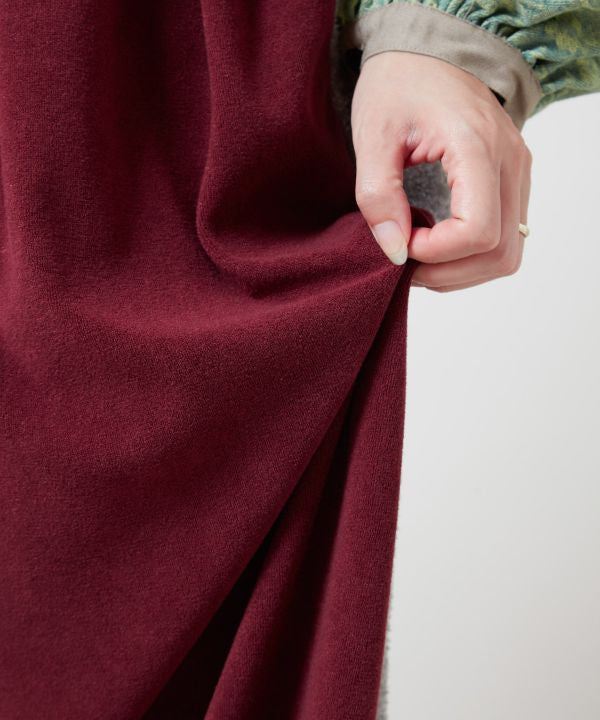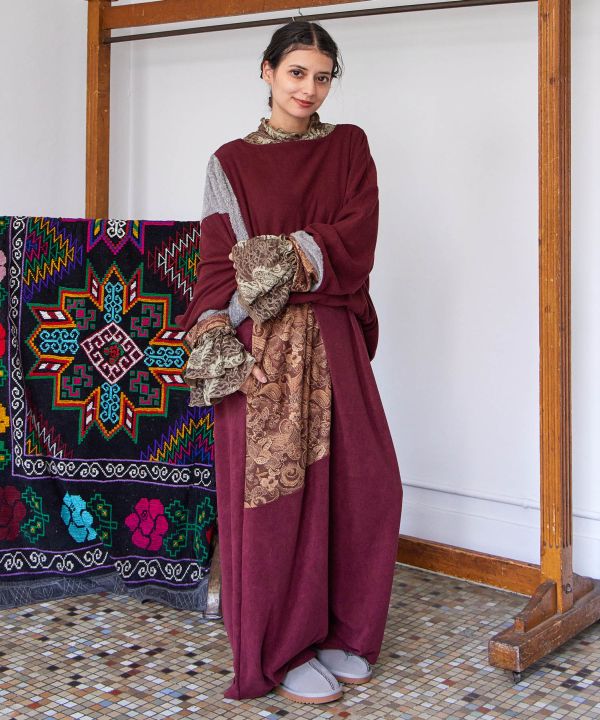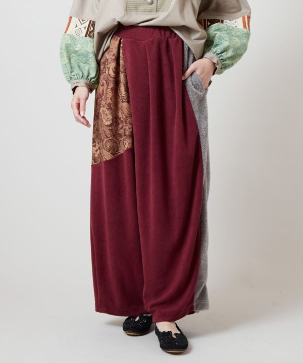 These pants feature a bold patchwork of patterned fabric with oriental floral patterns soft pile fabric, and boa. The key points are the stretchy fabric and the use of tucks that give the appearance of overlapping in the front. The elastic waist makes these pants a versatile item that can be worn without feeling constrictive.
