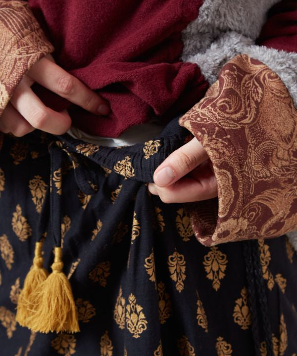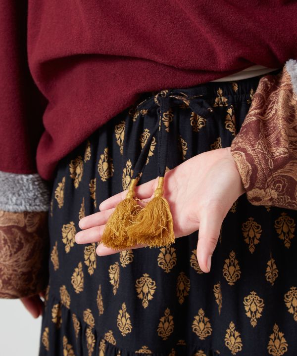 Inspired by fabrics sold at local markets in India. A tiered skirt with a folkloric feel and lamé print. The high transitional position gives it a casual look that is not too feminine. The lamé print pattern and gorgeous tape at the hem are key points.