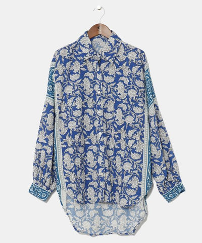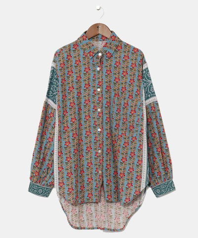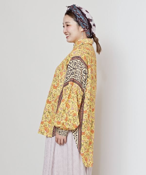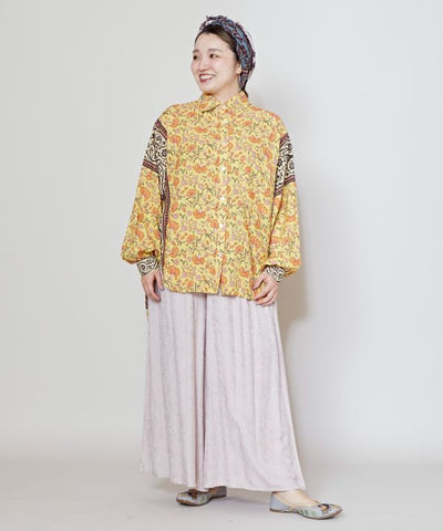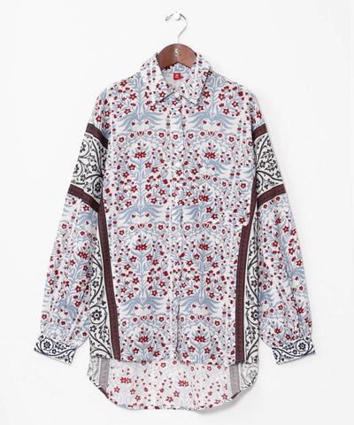 This women's shirt has a unique pattern switch. The warm floral pattern in a block print style is attractive. A versatile shirt that can also be worn casually.