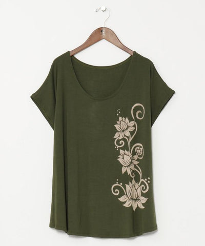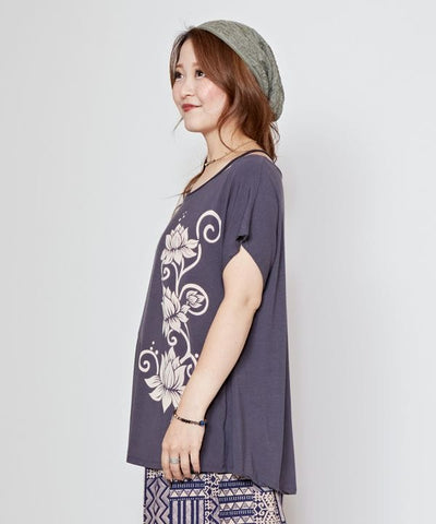 Carefully hand selected in Thailand. This T-shirt features a lotus on the front. The neck is wide, allowing for a stress-free fit. The lightweight fabric makes this a piece you will want to wear every day.