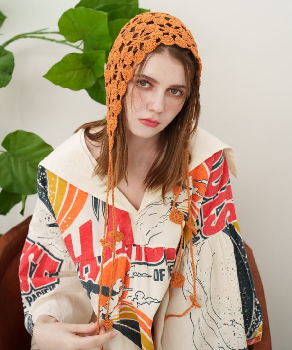 This crochet babushka-style cap features a soft, textured knit with a natural single-tone finish. Its versatile design makes it easy to match with various outfits, adding a subtle bohemian accent. A handcrafted ethnic-inspired accessory that highlights textile craftsmanship and relaxed styling, ideal for everyday wear with a natural, minimalist fashion aesthetic.