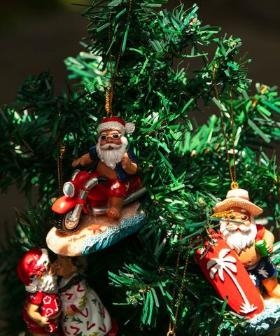 Christmas ornaments from Hawaii. This item reminds us of the Kaimuki Christmas Parade. We recommend that you not only display these lovely Hawaiian Santa ornaments each with a different expression, on a wreath, but also place them on your front door or on a shelf. Find your favorite Hawaiian Santa Claus.