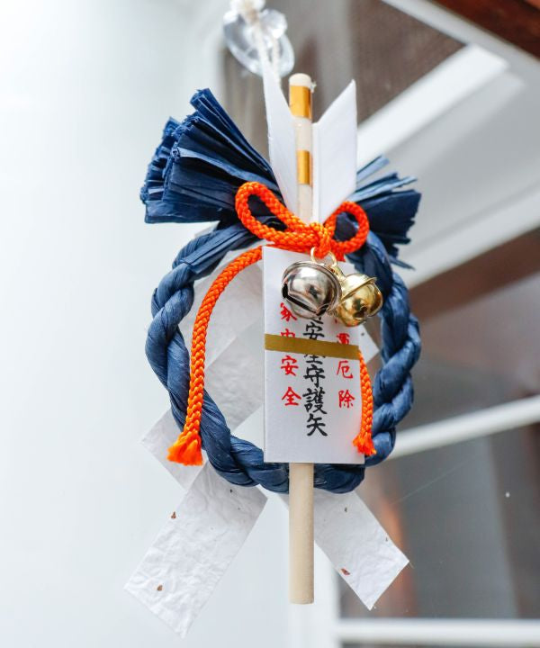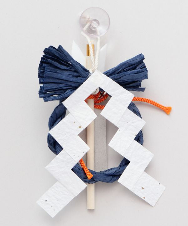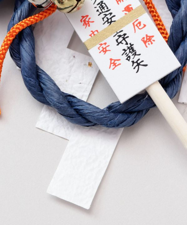 New Year's decoration for cars. This is a wheeled decoration for traffic safety using "Shide" (paper drooping) to represent the sacred and "arrow" and "bell" to ward off evil. It is also recommended as a gift.