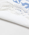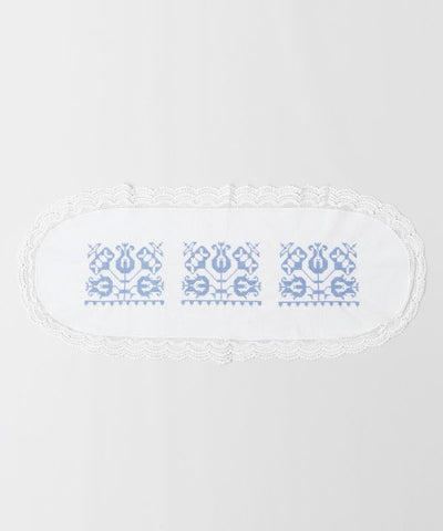 This cross-stitched tablecloth expresses a traditional European pattern. "Something Blue" is one of the "Something Four" items which are spells to wish for the bride's happiness. It is said that if the color blue is used in the wedding ceremony, it will bring happiness.