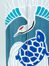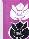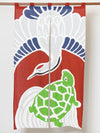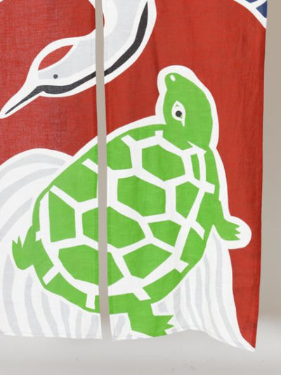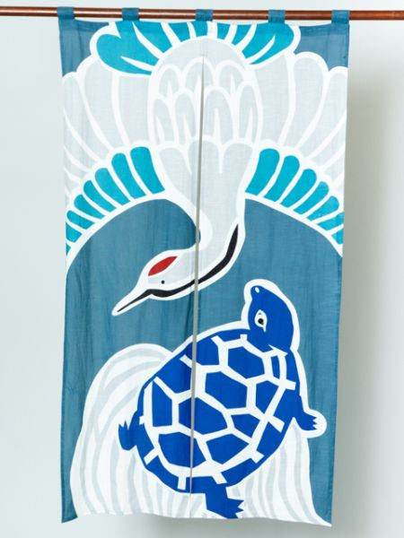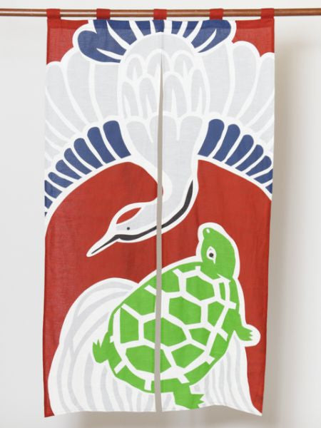 This is a series of "Noren" curtains that bring good luck. A piece with a bold design of a sea bream a crane and turtle for longevity, and a rabbit for a leap forward, which have been handed down as good luck charms from olden times.