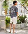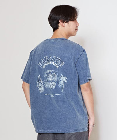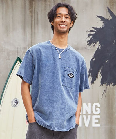 This denim-style cut and sewn men's T-shirt is easy to match with any outfit. The washed finish makes the fabric soft and comfortable to wear. The back of the T-shirt is embroidered with a surf culture design.
