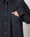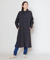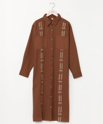 This dress is made of a rough textured woven fabric. The basic colors are easy to coordinate. The vertical line embroidery enhances the style. It can also be worn as a woven jacket with the front open.