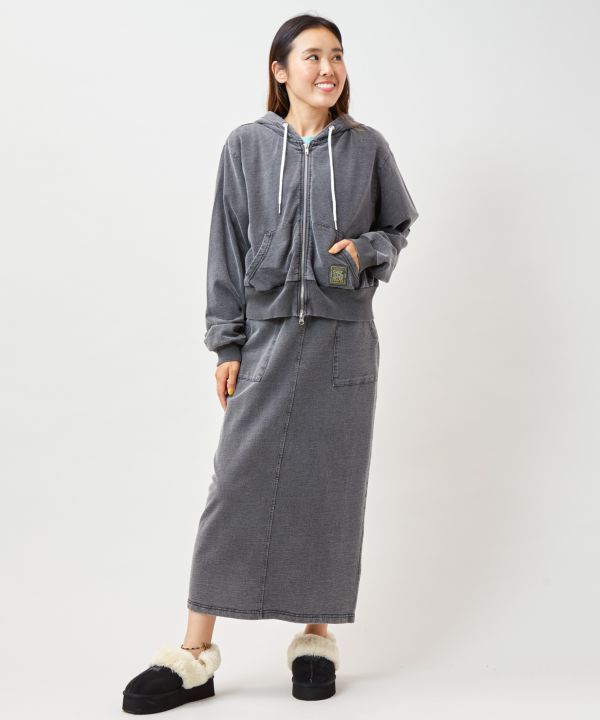 Hoodie in vintage denim-like lined material. Palm tree embroidery on the back gives it a surf casual style. The short length gives it a voluminous yet sleek silhouette at the hem. It is also recommended to wear with a skirt as a set-up.