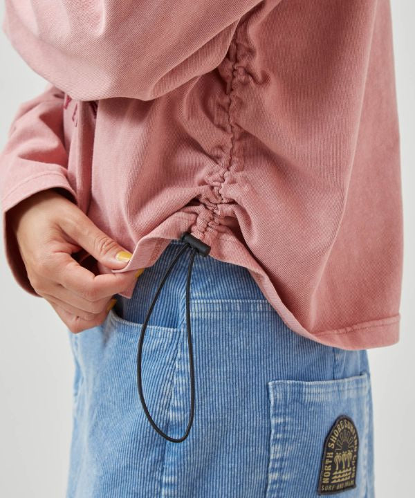 A simple men's T-shirt that changes to a vintage look with repeated washing. The front design is a combination of print and embroidery. Can be arranged to your favorite silhouette by drawing the drawstring.