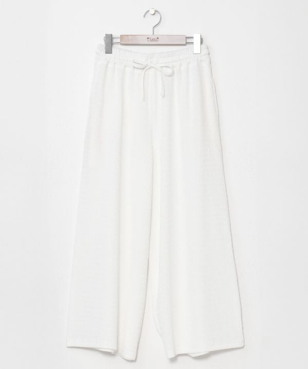 Flare pants made from soft cut-and-sew fabric with wrinkle-resistant stretch. The smooth texture feels gentle on the skin, while the elastic waistband ensures a comfortable and flexible fit. The relaxed silhouette creates a flattering drape and effortless movement, making these pants ideal for casual styling and everyday comfort while maintaining a clean, modern look.