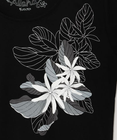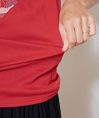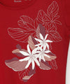 This hula lesson T-shirt features the Tiare flower and leaves that symbolize Tahiti. The skin-friendly cotton material is stretchy and does not stick to the body, making it suitable for everyday use. The chic shades of red and black accentuate the mature look.