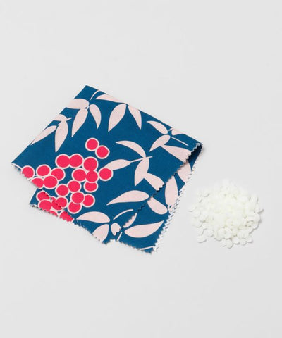 A kit for making wraps by soaking cloth in beeswax. The antibacterial and moisture retention properties of beeswax keep food fresh and because it is a natural ingredient, it is safe to use for wrapping. This eco-friendly wrap can be washed with water for repeated use. The auspicious "Nanten" pattern adds color to your dining table.