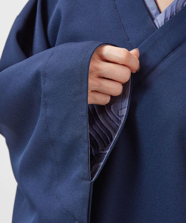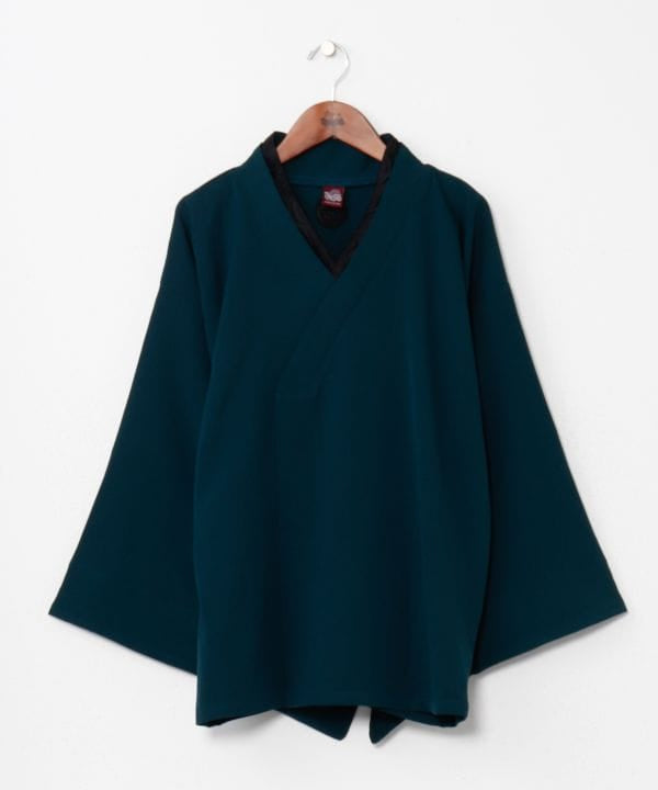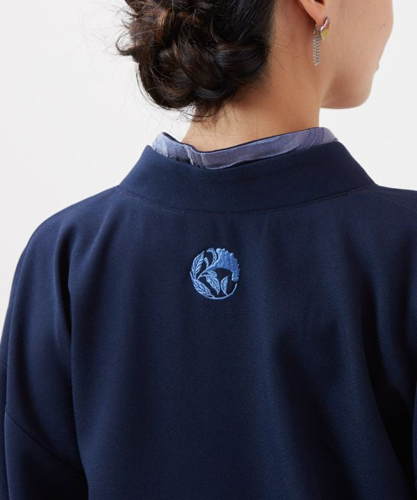 Pullover top in the shape of a kimono. Elegant jacquard fabric is used for the collar and cuffs. The back has an original design of flowers embroidered with "peony, lily, and catechu" fashionable crests. Match it with a skirt from the same series for a more kimono-like look.