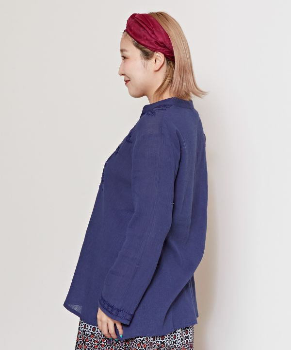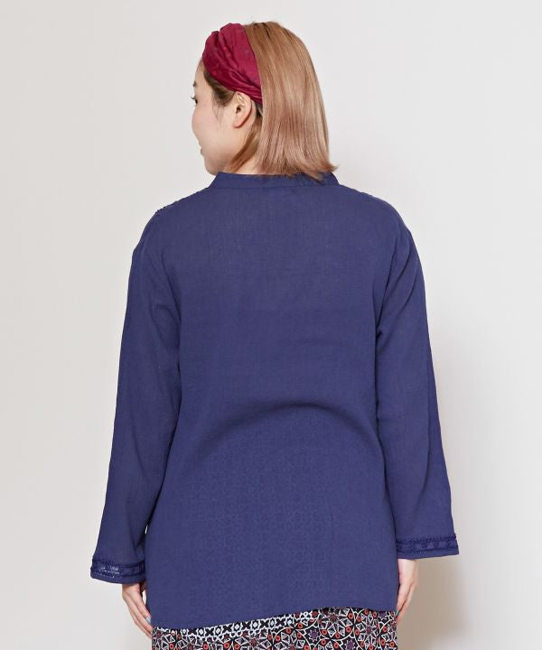This top is inspired by the traditional Indian kurta. The thin crepe material allows for stress-free wear. Richly decorated with rakhnou embroidery a traditional Indian craft.