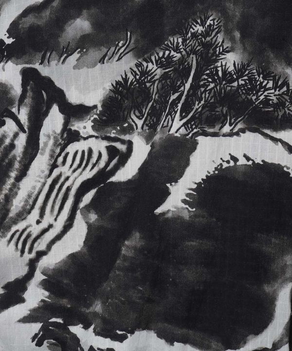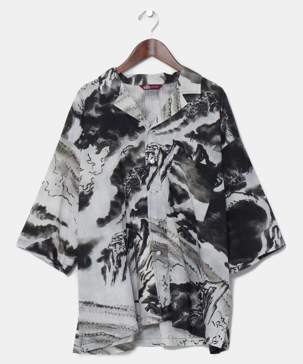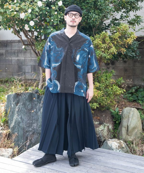 This open-necked shirt features a bold design of undulating, surging waves. This piece can be worn coolly with its light cotton material like a yukata (light cotton kimono). It is a naughty design that enjoys change, as the wind rises and rides the waves.
