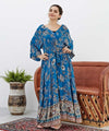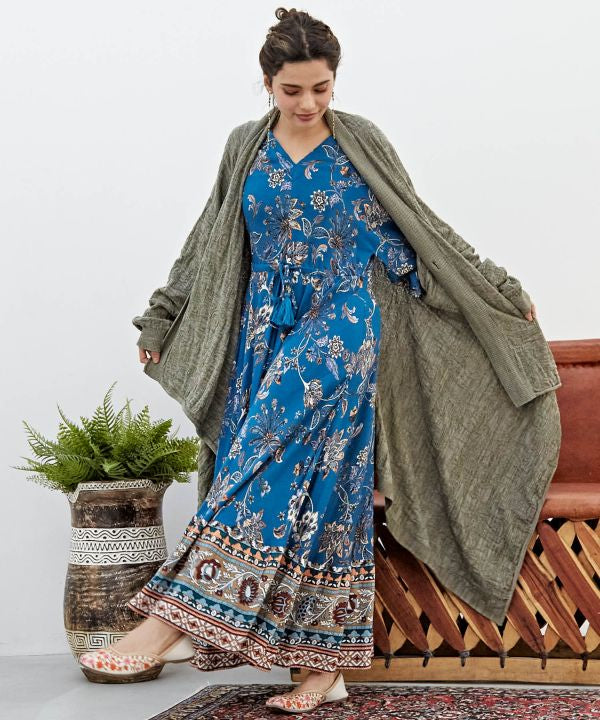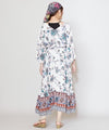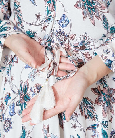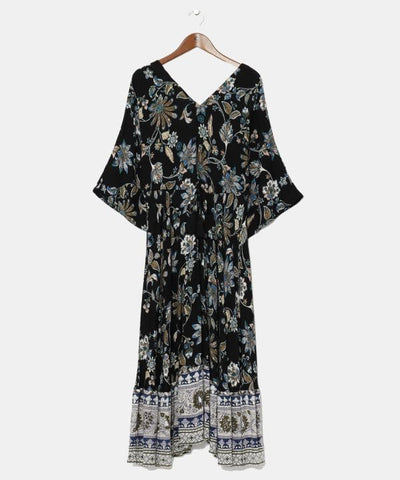 This gorgeous dress has a retro, delicate floral pattern that gives it a vintage look. The rayon material's unique fall, V-line at the bust, and waist markings give this piece an elegant feel.