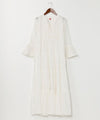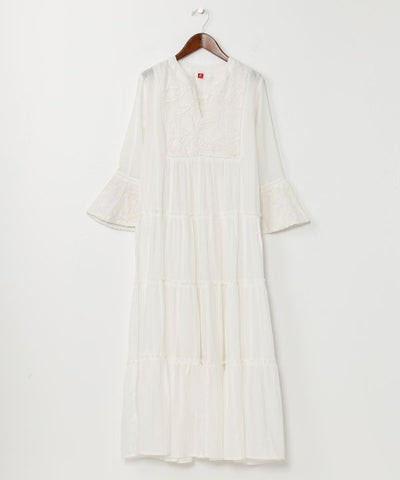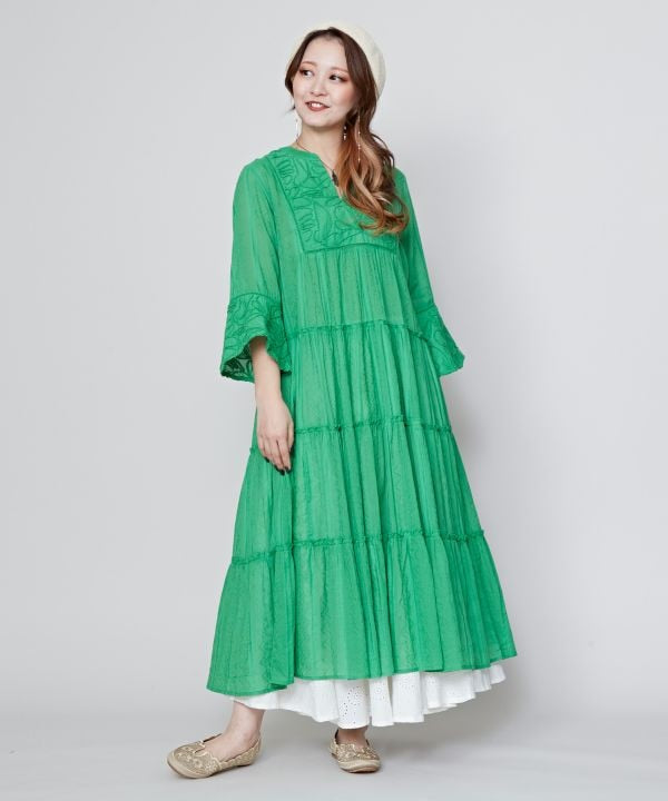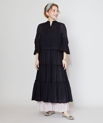 This eye-catching dress features a switch between dobby fabric with an appealing uneven and shiny texture and embroidery fabric. The bell sleeves and tiered skirt give a beautiful impression. The transparency of the fabric allows you to enjoy layered coordination.