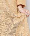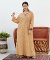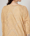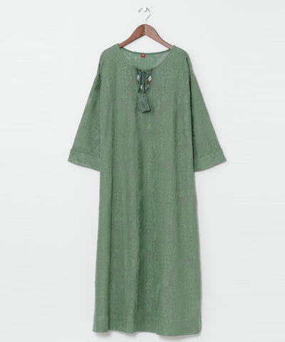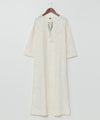 This dress is made of cotton lace with an arabesque pattern reminiscent of Uzbekistan. The transparent lace material is impressive. The silhouette is sleek and clean, and the neckline is embroidered with arabesque architectural motifs.