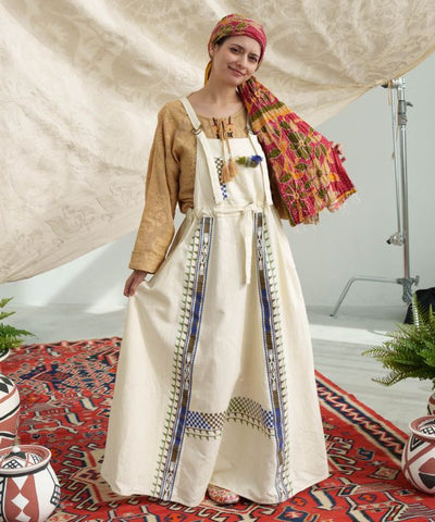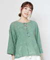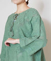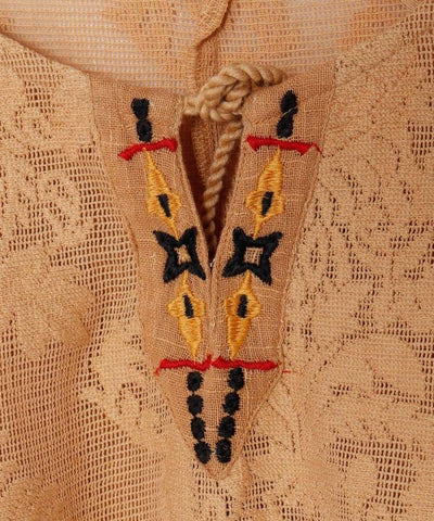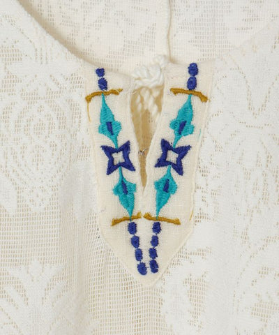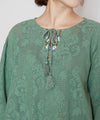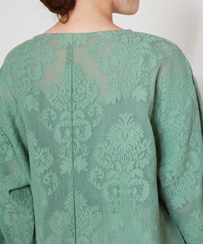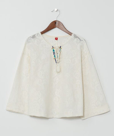 This women's top is made of cotton lace with an arabesque pattern reminiscent of Uzbekistan. The transparent lace material is impressive. The silhouette is sleek and clean, and the neckline is embroidered with arabesque architectural motifs.