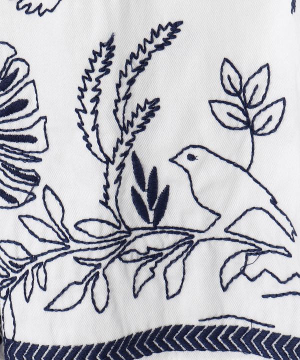 Men's pants made of comfortable soft cotton. Straight silhouette with clean lines, adjustable waist with elastic and inner ties, and embroidered trees, leaves, and birds on the hems. The color palette is inspired by the hippies of the 70's, and the pants can be worn with a shirt for a set-up look.