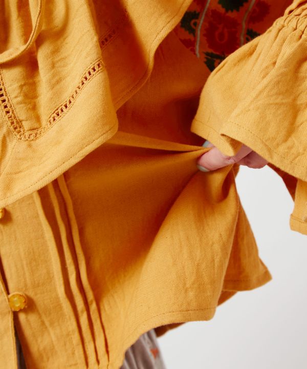 This attractive top has lacy candy sleeve sleeves and a large collar. The impressive collar is detachable for a two way look. The cuffs are elasticized for adjustable length. Pintucks on the body add elegance and embroidery from the shoulders to the sleeves adds glamour. The flower-shaped buttons are eye-catching. It is also recommended for the trendy layered style with an attached collar wrapped around the waist. The embroidery motif is Suzani embroidery from Uzbekistan. Meaning of the pattern Pomegranate: symbol of abundance Flower: symbol of life rooted in the earth Sun: source of all energy.
