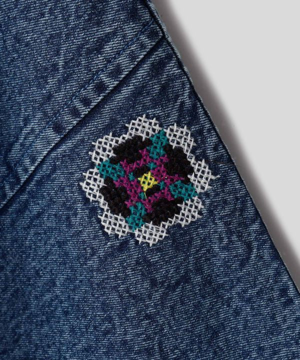 A vintage washed dolman sleeve style denim shirt. With the theme of Uzbekistan, the crossroads of the Silk Road, the collar is decorated with the chapin, an ethnic costume, and the china-style buttons are decorated. The front has a nice pocket. The embroidery motifs include stitches used on rugs and Uzbek language Salom: Hello Rahmat: Thank you.