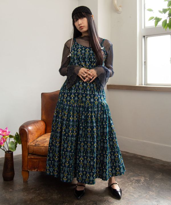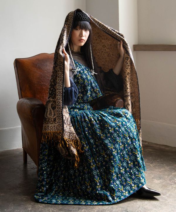 This gorgeous camisole top is made of all-over embroidery fabric, which is also used in Indian bridal dresses, and is sure to make your heart dance. The length of the shoulder straps can be adjusted at the back. The gorgeous embroidery throughout and gently sweeping shape accentuate femininity. The velour fabric with a sense of weight makes this a gorgeous item.