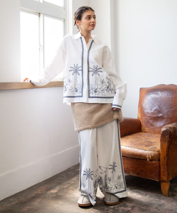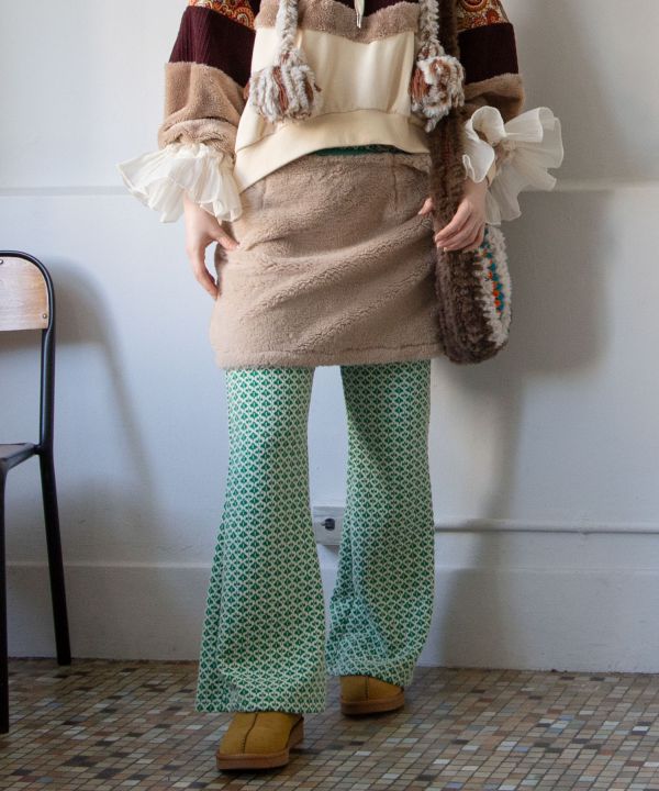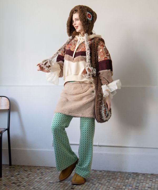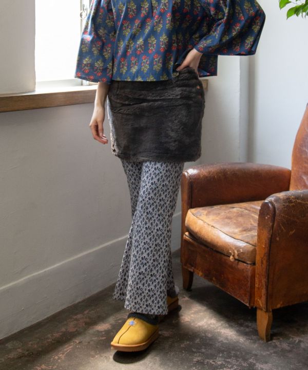 Lined mini skirt with warm, fluffy faux fur. Made of Indian block print style floral fabric with walnut buttons. We recommend wearing it with a short length top for a layered look. Simply add this item to your regular outfits to enhance the atmosphere.