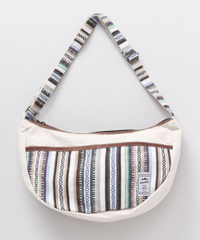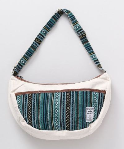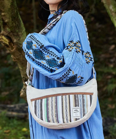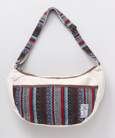 This half-moon shaped shoulder bag is made of a traditional Nepalese woven fabric. The village leather used at the points of the bag adds to the impression. The popular shape of the bag follows the body when slung diagonally so it does not interfere with your movements even in active scenes. It has pockets on the front and inside for multiple storage and ease of use. Pahar means mountain in Nepali. It is a dreamy series that seems to exist together with the nature of the Himalayas, the highest mountain in the world.