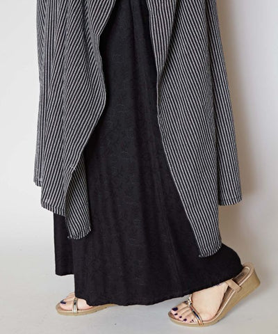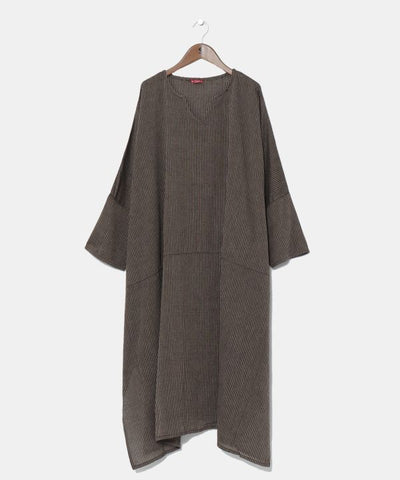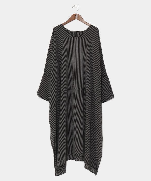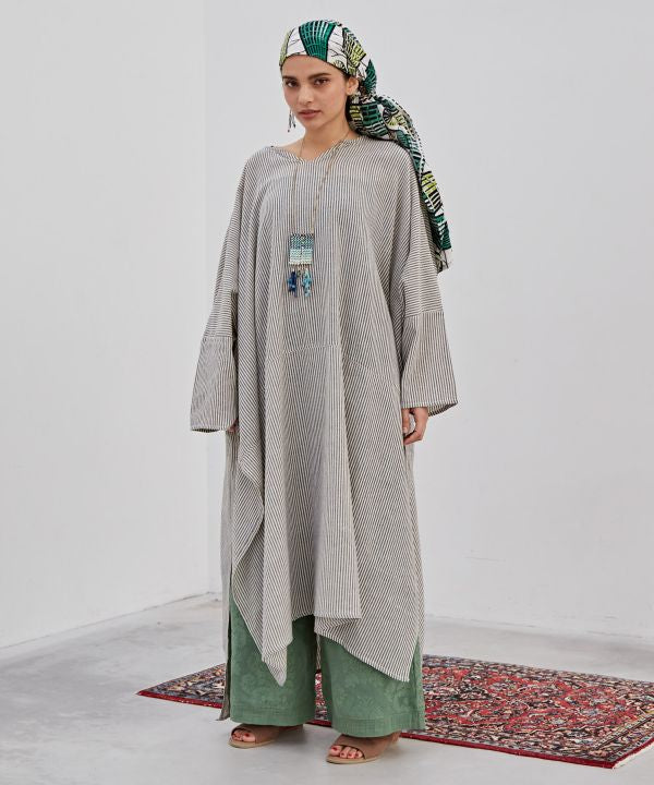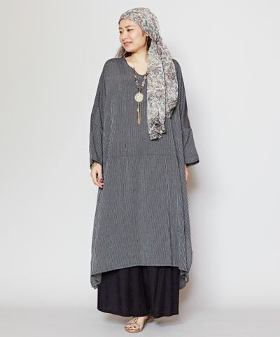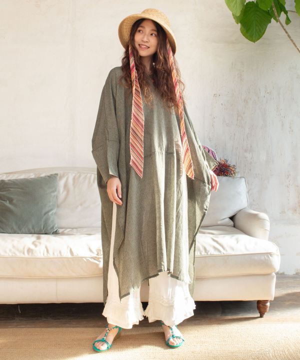 This dress is impressive for its bold use of slits. The loose fit allows you to wear it size-less. The soft Nepalese fabric is comfortable through the wind. The stripe pattern in subdued shades accentuates the chic mode. Great for casual occasions.
