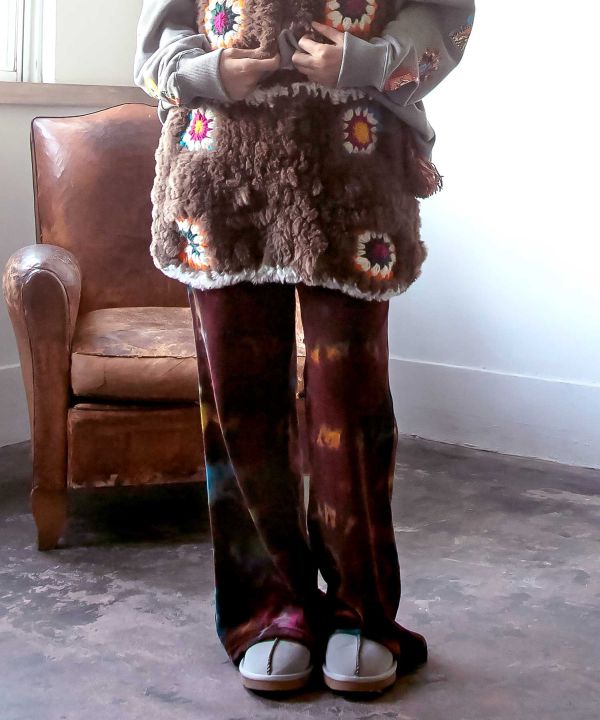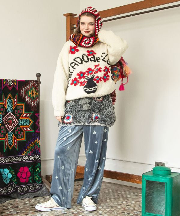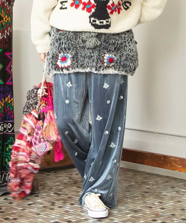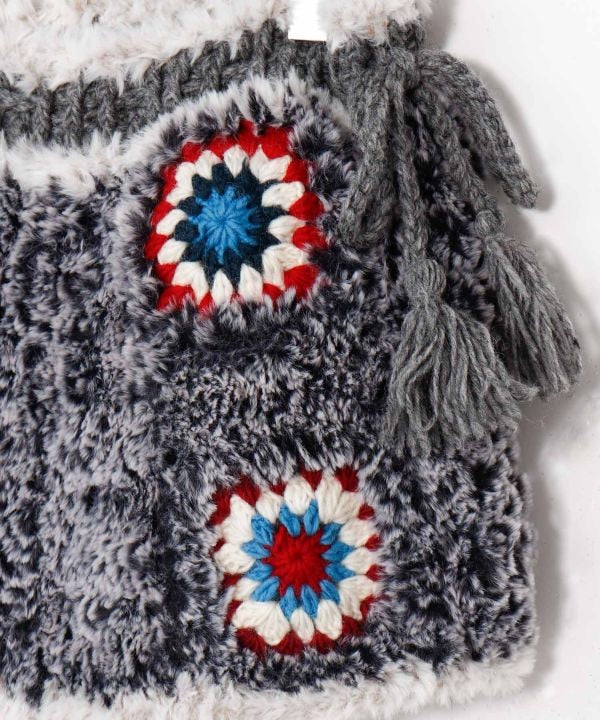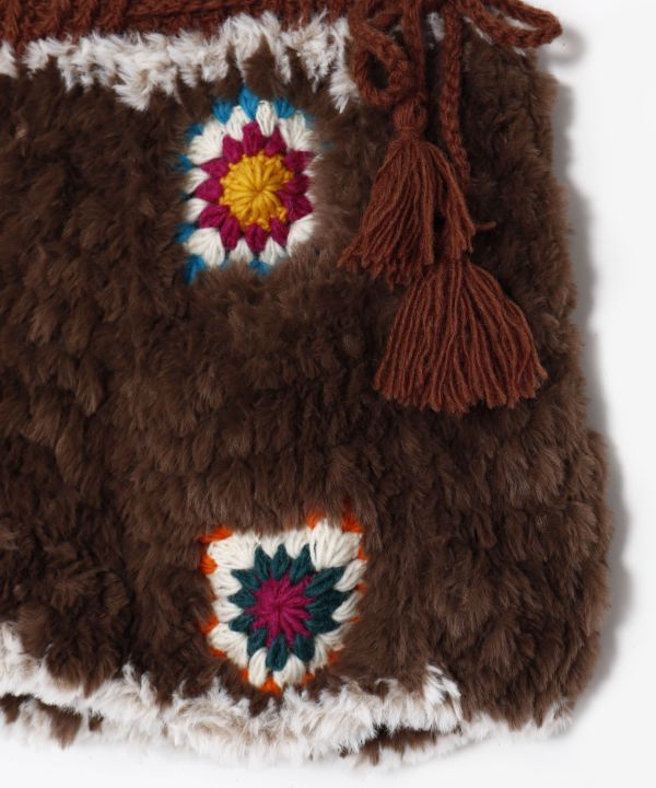 Soft and warm with thick fur yarn this skirt is hand-knitted by artisans in Nepal. The colorful crochet and tassel strings on the side are key points. Recommended for layered coordination with pants.