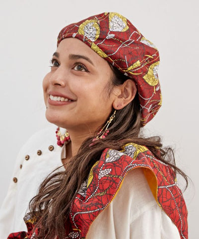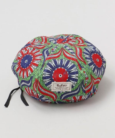 Reversible beret from the RAFIKI series, which means "friend" in Swahili. The pattern is reminiscent of the land of Africa. It is a perfect item for outdoor scenes, adjustable in size, and reversible. The size can be adjusted and the beret is reversible, so you can change between the pattern and solid color depending on your mood.