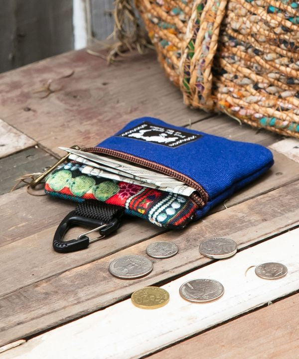 This case with carabiner is decorated with traditional patterns from around the world. The zipper opens to a two-layered partition, which can also be used as a small coin case. There is also a pocket on the outside large enough to hold keys. The design is inspired by the traditional embroidery of the Akha, a hill tribe in Thailand.