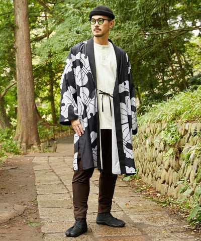A men's kimono-like haori with a boldly arranged Heishi (瓶子) family crest motif. A bottle is a small jar used as a sake vessel, and is also used as a sacred vessel offered before the gods. The lightweight fabric is comfortable to wear and can be worn throughout the year. With pockets on both sides.
