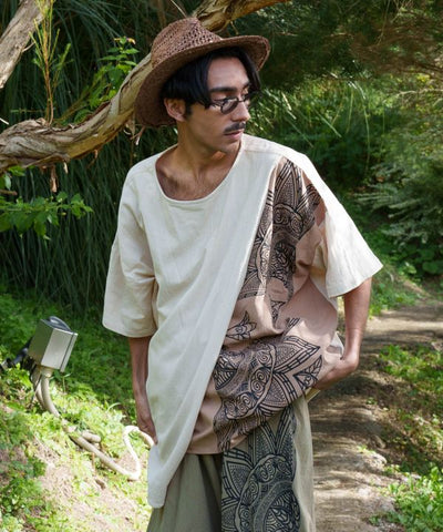 This men's top is inspired by the Spanish tradition of Damasquinado gold and silver work. The bold prints and layered style transitions make for a playful design that is sure to captivate. The cotton material is soft to the touch. Wear it on your journey with your own unique style.