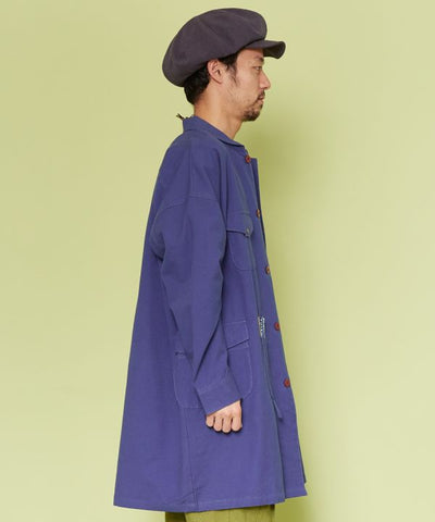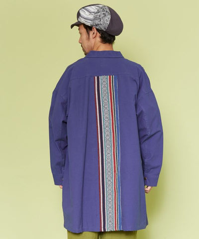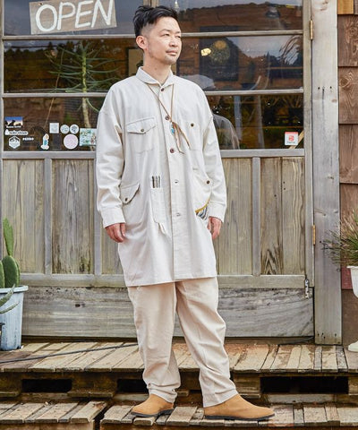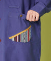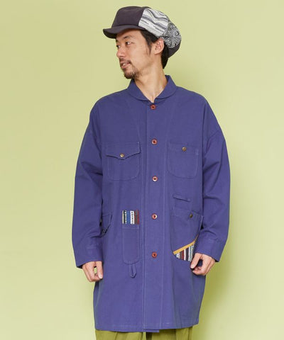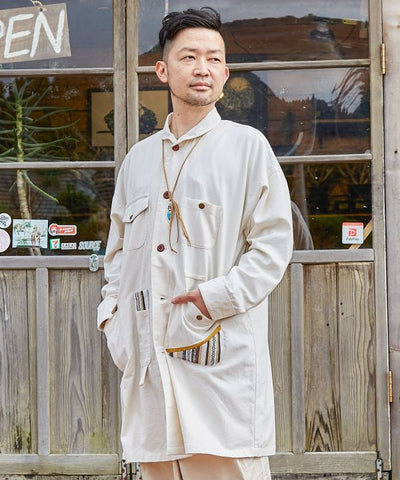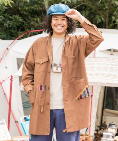 Fisherman themed coat inspired by Nepal. This piece is made of Nepal's characteristic cotton and jacquard fabrics, with attention to detail. The highly practical pocket specifications and loose, straight shape are also recommended for camping scenes. It is excellent for storing even tableware and small tools used for camping. Furthermore, the combination with the jacquard is a key point of attention.