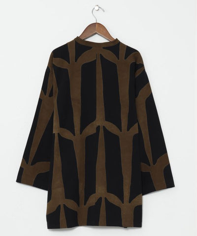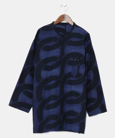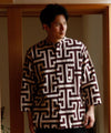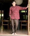 This is a men's open-necked shirt with auspicious pattern. "Manjimon" that is said to bring happiness. "Wa-tsunagi" is a pattern of unceasing peace that continues indefinitely. "Hishi-mon" is a pattern that wishes for the prosperity of descendants and good health. This is a piece that can be worn as a Haori with a brave and chic color pattern inspired by the fire extinguishers of the Edo period. It has a long, narrow pocket on the left chest for holding a fan.